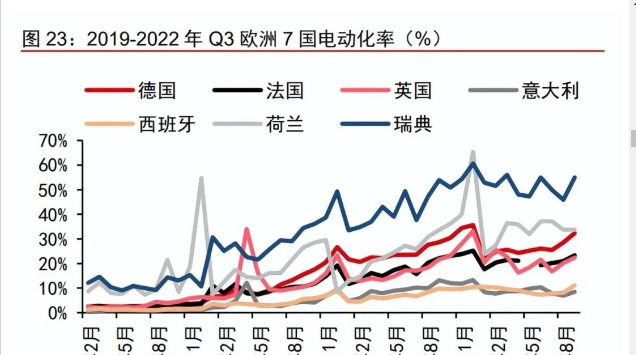 歐洲 2022 年前三季度電動車銷量達 164.3 萬輛,同比增加 7.2%。考慮到 2022 年歐 洲市場電動化趨勢持續提升,我們預計歐洲市場 2022-2023 年電動車銷量分別實現 209/243 萬輛,同比+10%/+16%,2022 年整體景氣度受到地緣政治影響明顯。