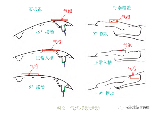 通常我們的瀝液孔在前艙內板的最低點,排氣孔會開在內板與外板壓合處的最高點,所以工裝的長度一般要高于兩翼,前艙蓋和后行李箱蓋鉸鏈的開口在30°~40°即可,注意這種角度狀態一定是瀝液孔在最低點處,如果不是最低點,我們可以通過工裝加長或減短來調整瀝液孔的所處位置,同時要滿足鉸鏈的開口在30°~40°,如果超出范圍,申請設計變更增加瀝液孔。可以根據電動葫蘆輸送系統擺動的原理,當車身擺動時,氣泡會隨著擺動移動位置,讓電泳液在前后蓋內腔充分與前后蓋外板內表面接觸成膜,見圖2。