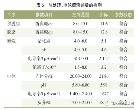 當電極開始通電時,首臺車身后蓋與第二臺車身的前圍同時面對距離相同電泳漆,而該區域由于車身泳動循環相對較差,非常容易發生陽極化,針孔很容易出現。前處理、電泳分段驗證分析見表 4。