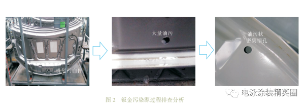 根據現場調查發現白車身經過前處理、電泳及電泳烘干工序后,車型引擎蓋、四門窗框等部位電泳漆膜表面存在火山口狀的縮孔,目視表現為縮孔深淺不一且密集,均為典型形狀的小圓形縮孔,并伴有明顯的油漬。電泳漆膜縮孔問題的出現,增加了對電泳涂膜的打磨工作量,部分打磨不徹底的電泳漆膜縮孔,還會影響車身面漆的外觀質量,而且打磨造成的電泳漆膜局部膜厚不足及露底現象影響車身的防腐蝕性能。