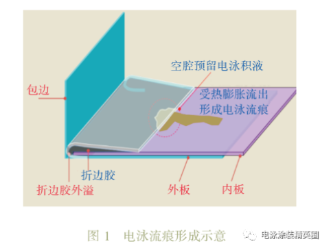 面面貼合線型是指兩個部件搭接,兩個平面相接觸,因為形成空腔兜液,在電泳烘干過程中,液體延著線邊縫隙流出,形成電泳流痕(見圖 1),常見為四門鉸鏈、中立柱鉸鏈、四門兩蓋包邊位置。