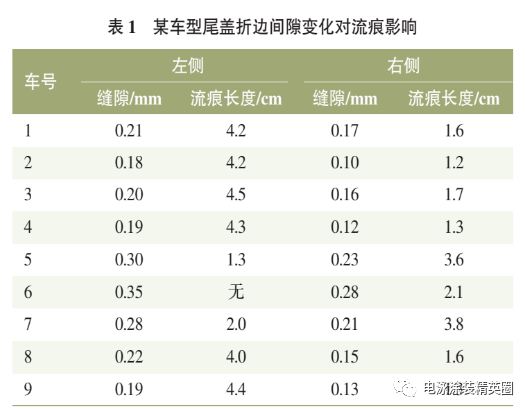 在前處理電泳工藝槽液參數穩定的基礎之上,此類的電泳流痕影響因素主要包括縫隙大小和涂膠規格。如問題車型 A 尾蓋包邊處電泳流痕發生概率52%,為了記錄尾蓋包邊間隙變化過程對流痕的影響,利用夾縫尺分別檢測尾蓋左右兩邊折邊間隙值,并記錄結果(見表 1)。縫隙大小對電泳流痕的影響結果為:鈑金間隙 0.2 mm 時尾蓋外板流痕情況最嚴重,當鈑金間隙大于0.3 mm 或小于 0.1 mm 時,流痕問題減輕;當鈑金間隙為0.35 mm時,尾蓋外板無流痕問題(此結論僅限抽檢車的鈑金結構,其他部位可進行參考借鑒)。