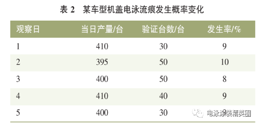 面面貼合線型另一影響電泳流痕的因素就是涂膠規格,其中膠距和膠徑是常見的兩個變化因子。如果膠距和膠徑控制不好,在折邊的過程中容易形成空腔兜液,進而產生電泳流痕。如問題車型 A 機蓋包邊電泳流痕發生概率50%,在壓合邊間隙小于 0.1 mm 的情況下,考慮調整膠距和膠徑是我們改善的方向。膠距過大和涂膠量過少有利于空腔的形成,從減少空腔的方向出發,分別進行膠距不變、膠徑增加 1 mm和膠徑不變、膠距減少 1mm的試驗,結果顯示:當膠距為(6±1)mm,膠徑為(3±1)mm時,機蓋包邊的電泳流痕由 50%下降至 9%左右,效果明顯(見表 2)。