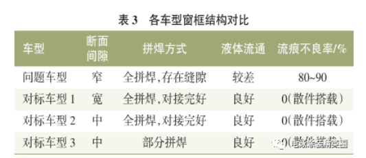 定位孔/安裝孔型是指在定位孔/安裝孔的周邊,由于沖孔夾層內積存電泳液,在后期烘烤時沿圓周邊爆出,形成電泳流痕,常見四門窗框有孔結構的位置。定位孔/安裝孔夾層間隙對流痕影響很大,減小間隙可改善內腔積液,從而減小流痕發生概率。然而,定位孔/安裝孔往往由于位置布局的影響,布局緊促,四周空間位置小,尤其是輥壓工藝的窗框結構,無法通過增加焊點或者調整輥壓壓力等傳統手法來減小空隙。由于夾層間隙無法消除,再加上電泳泳透力緣故,只要有間隙,電泳液就有可能滲入夾層空間,在表面張力下進入,沖洗浸泡工藝無法將其沖洗掉,滲入的電泳液在后期烘烤過程中爆出形成電泳流痕。既然封堵無法形成絕對的封閉內腔空間,那么改善思路往往是由“封堵”變為“疏通”,加大液體流通通道來改善流痕。如問題車型 A后門窗框定位孔/安裝孔產生的電泳流痕發生概率達90%,前期進行了多次驗證試驗,如在孔周圍增加焊點來減小間隙,通過改善沖頭和凹膜結構實現對沖孔壓緊,減小間隙改善內腔積液,從而減少流痕發生概率,但只能部分改善,由于夾層間隙無法消除,因此不能避免流痕產生,從而無法消除流痕不良。通過對窗框結構對比分析(見表 3),發現增大斷面間隙并使用部分拼焊的方式,預計可增加電泳液流通性,對改善流痕有利。最終通過對上條斷面縫隙調整和上條拼接面增加切口,增大了流通量,從而使流痕發生概率由 90%下降至5%甚至消失。