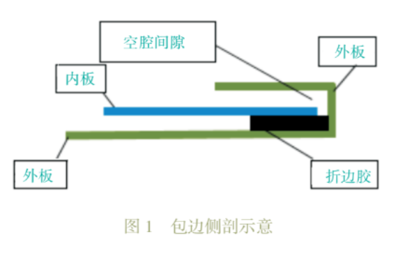 汽車車身的五門一蓋的包邊結(jié)構(gòu)基本一致,都是由于外板、內(nèi)板和折邊膠三者構(gòu)成,外板包裹著內(nèi)板和折邊膠,三者相互作用形成空腔,空腔的大小由三者共同決定。