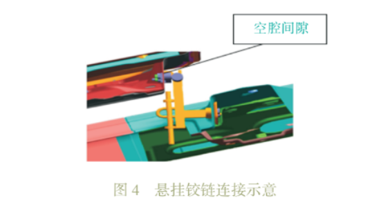 鉸鏈位置的空腔間隙主要來源于兩個方面:一是鉸鏈安裝面和車身板面的貼合間隙,二是鉸鏈和緊固螺栓的配合空腔,此空腔間隙從圖 3 能明顯看出。