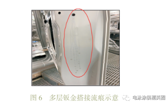 某車型中門區(qū)域內(nèi)板鎖孔位置為門內(nèi)板和鎖扣加強(qiáng)板通過焊點和結(jié)構(gòu)膠固定,經(jīng)過前處理電泳后兩層鈑金之間存在電泳殘液,烘烤時從鎖孔位置流出,故障率在50%左右,故障模式如圖 6 所示。