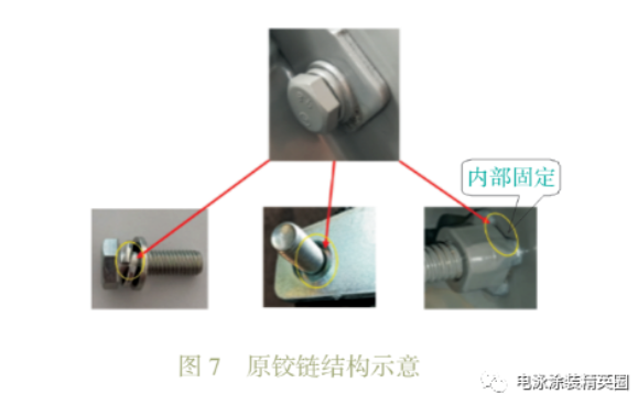 鉸鏈區(qū)域的連接方式如圖 7 所示,連接固定后存在空腔,經(jīng)過驗證,此類結(jié)構(gòu)通過純水沖洗無效,加大扭力無效,打磨搭接位置也無效果,但是可通過更換連接螺栓種類,采用自帶墊片、接觸面較大且具有較好防松作用的螺栓,故障率由80%降至5%左右。
