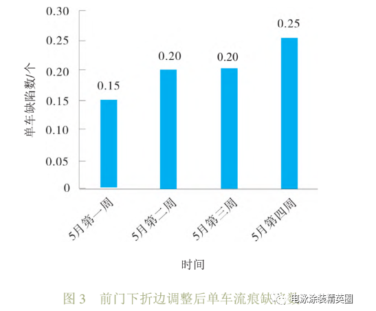 至此,尾門框流痕整體改善完成。單車流痕缺陷數由 1.6個下降到0.9個左右。雖然流痕缺陷數下降不明顯,但是整體流痕狀態減輕,而且也能達到車間指標,基于成本考慮,改善完成。跟蹤 1個月的數據,E 車型單車電泳流痕缺陷數由 5.3 個下降到2.3個,目標達成。
