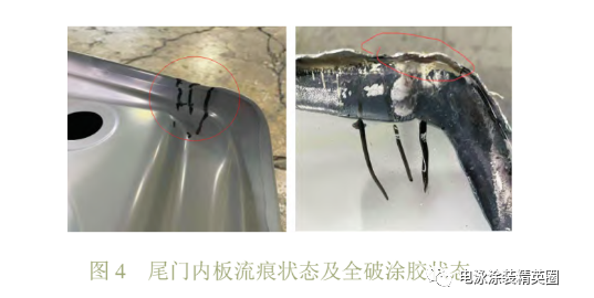 經觀察,尾門流痕主要集中在左側尾門內板上折邊凸臺位置,單車流痕缺陷數高達1個。而且流痕長度達60 cm,貫穿整個尾門上下,影響極其嚴重。尾門內板折邊膠由人工涂膠,由于上折邊造型問題以及涂膠起槍位置問題,左側涂膠容易跳槍,造成涂膠狀態不穩定。根據全破車發現,左側尾門上折邊涂膠不到R角,不滿足要求,導致電泳漆積液,最終形成流痕,如圖 4所示。