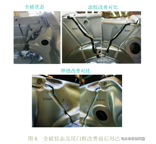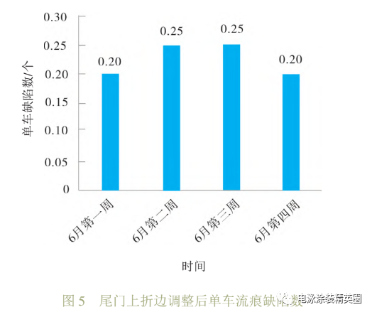 此處全破時發現涂膠未全部充滿焊縫,根據現場實際情況,采取了以下措施:1) 增加此處焊縫涂膠,改善前尾門框涂膠直徑 2 mm,通過放慢涂膠速度,增加尾門框的涂膠量,改善后尾門框涂膠直徑 3 mm,焊縫充滿膠。2)通過零件敲擊,減少尾門框間隙,由0.5 mm下降到0.2 mm,尾門框流痕單車缺陷數由1個下降到0.6個,如圖8所示。