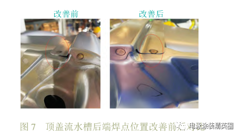 因側圍與頂蓋為拼裝后焊接,頂蓋流水槽與側圍拼接縫沒有涂膠,拼接焊縫存在間隙,導致此處存液形成流痕。為減少此處間隙,調整焊接固定工裝,將末端焊點后移8 mm,改善后流痕降低 50%,由0.6個降到到0.3 個,如圖7所示。